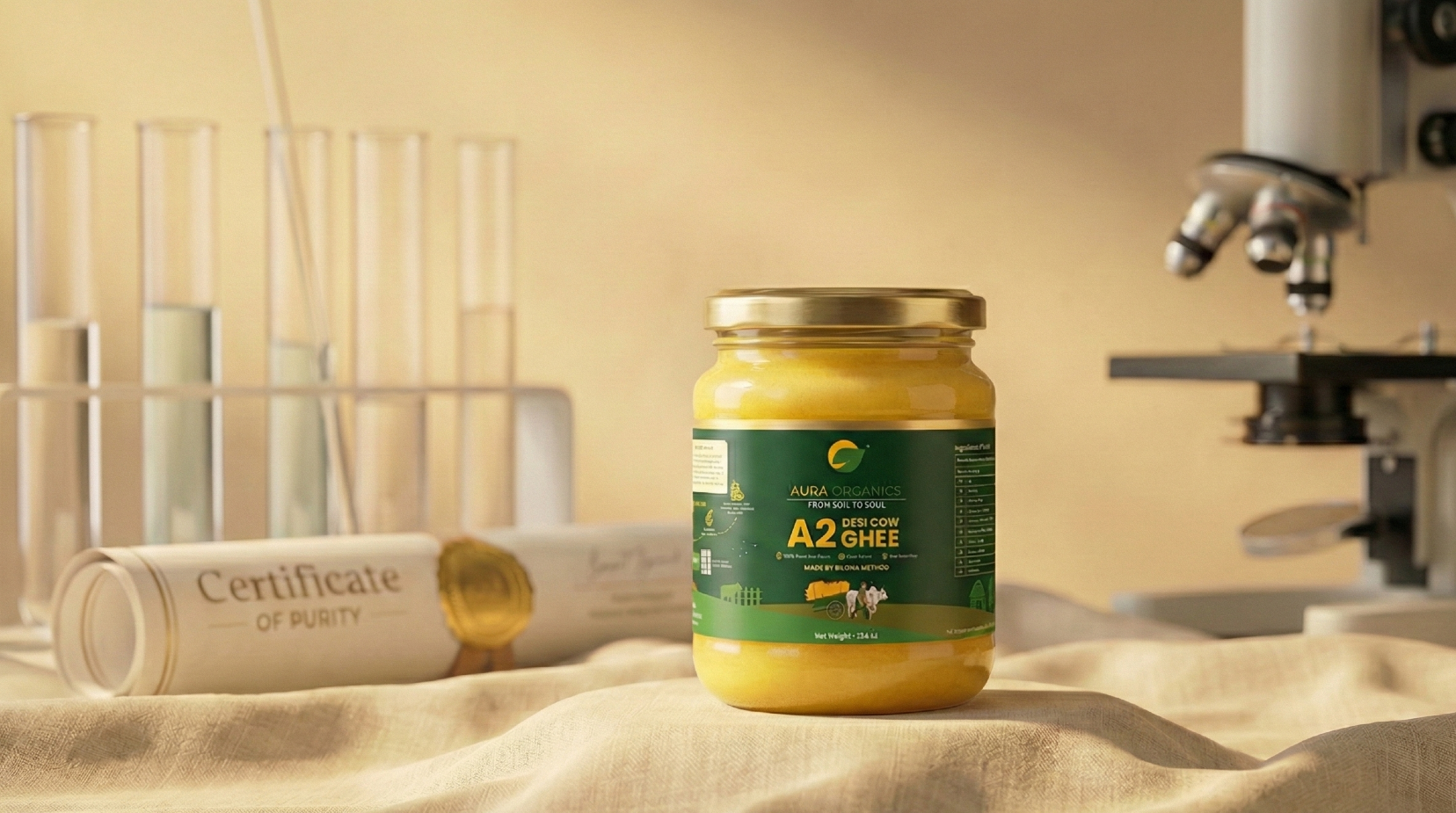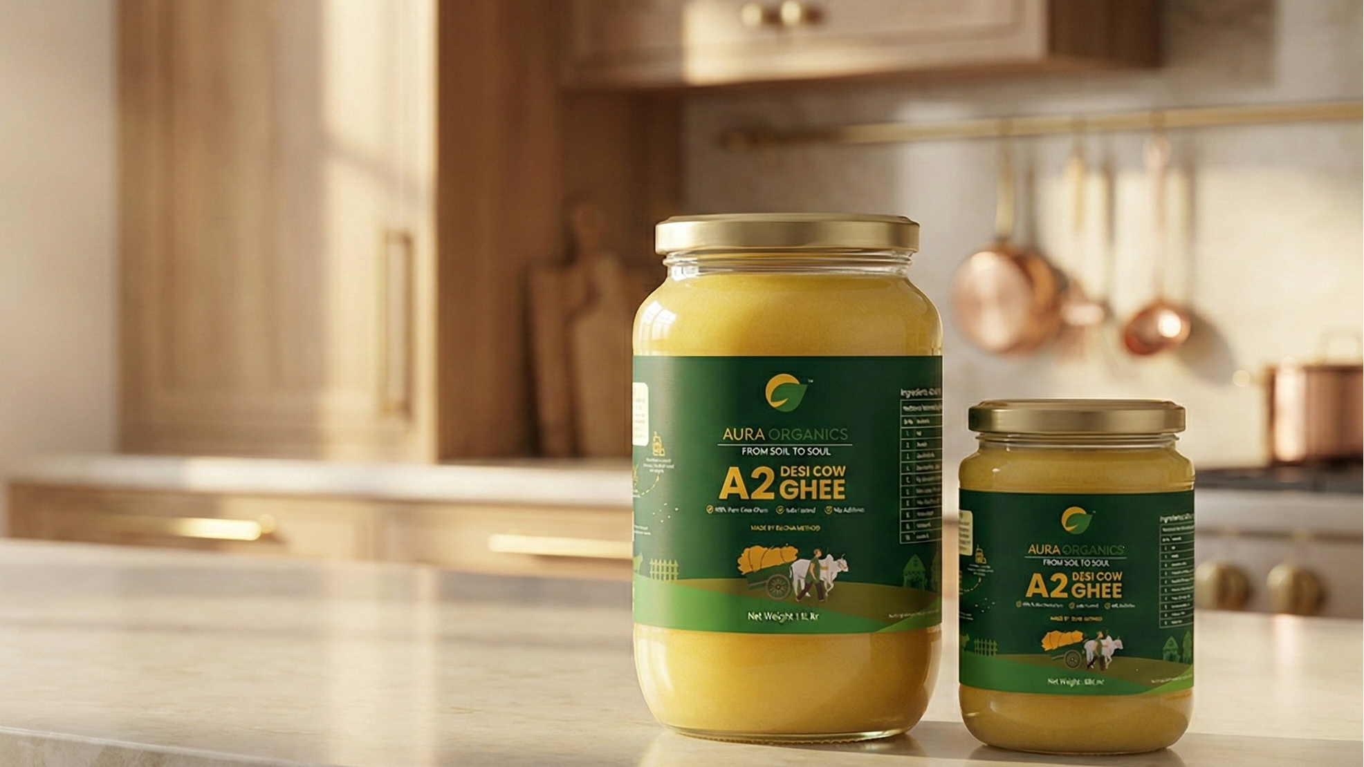 Aura Organics brings pure, traditionally crafted A2 Desi Cow Ghee to your home. We work directly with farmers, follow ethical cow care, and prepare ghee using the ancient Bilona method — no shortcuts, no compromise.